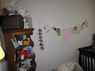 K's mom graciously offered to purchase the crib for us and suggested a convertible model that would carry H through the years. In an act surely induced by pregnancy insanity, I gave K the job of selecting the crib. Know what? I think he did a really good job. I registered for the Dwell Studio for Target rockets bedding set, which my grandmother purchased. I thought it was boyish without hitting you over the head. It came with a bumper and comforter, but those aren't safe for H yet. In the crib he's got a group of his very favorite things: sleep sheep, musical glowing seahorse, dinos and ugly doll. On the wall, I strung up a few things that were colorful and special to me in lieu of expensive prints. I included an ultrasound pic (this was creepy to me at first, but I ended up being really comforted but his little face in the images), pics of my mom and dad and me when I was a baby, the invite for my shower, my mantra, darling letter prints for K and me, a string of elephants given to me sometime (can't remember) and a tile that was given to me as a gift for an internship I did at Smith. The mobile is a flensted and the curtains are a work in progress.